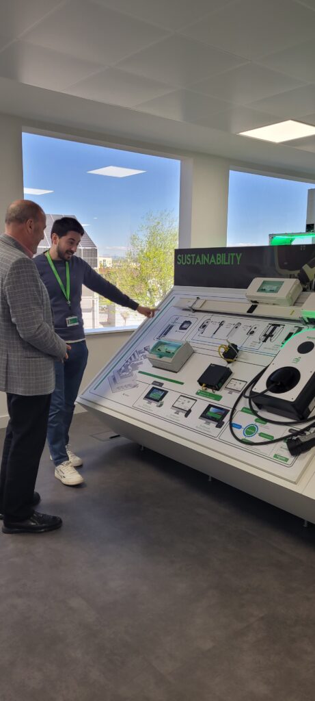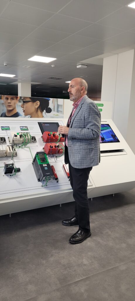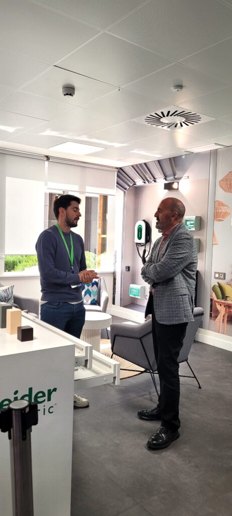 Durant la visita al nou showroom, l’Innovation Hub, guiat per Héctor Martín, Technical Sales Engineer —excel·lent amfitrió— i amb el suport d’Alberto Gutiérrez, Coordinador de Programes Elèctrics, vaig conèixer les solucions innovadores que Schneider Electric està desenvolupant per avançar cap a edificis intel·ligents i sostenibles.