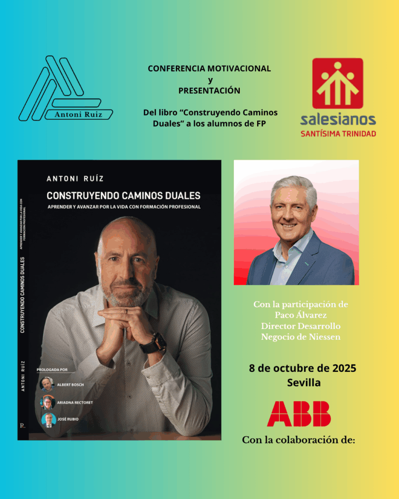 El passat 8 d’octubre, vaig tenir l’honor de presentar el meu llibre Construyendo Caminos Duales en un lloc ple d’història, valors i compromís educatiu: el Col·legi Salesià Santíssima Trinidad de Sevilla. Em va acompanyar un gran amic i referent del món empresarial, Paco Álvarez, director de Desenvolupament de Negoci a Niessen – Grup ABB, amb qui vam compartir una conferència profundament motivadora.